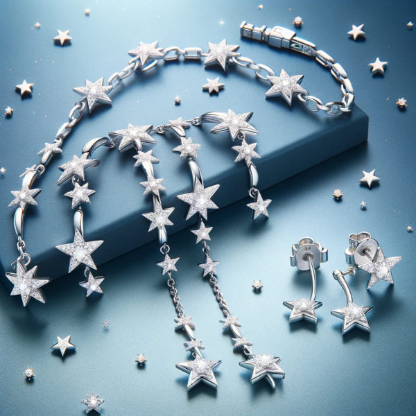 Here are matching bracelet and earrings designed to complement the star-themed white gold necklace. The bracelet features similar star-shaped motifs, crafted in polished white gold. It has a delicate chain with star charms or a more solid design with stars integrated into the band. The earrings echo the star theme, with smaller star-shaped studs or dangling stars, incorporating the same polished white gold and sparkling elements like diamonds or crystals. Both the bracelet and earrings maintain the elegant and whimsical style of the necklace, completing a celestial-inspired jewelry set that captures the beauty and wonder of the night sky.